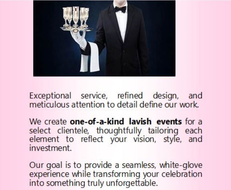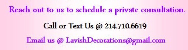 Thank you for your interest in Lavish Décor. We are extremely excited for the opportunity to serve you and to be a part of this very memorable experience. A little bit about us and what makes us unique is that a substantial portion of our business is based solely on customer referrals. We are a full-service upscale, and affordable event provider and we stand by your side every step of the way from the time of consultation to the delivery, set up and removal of all rentals provided. Each client receives a free consultation. We also provide additional support when the client is in need of a dedicated events coordinator to facilitate a successful program.